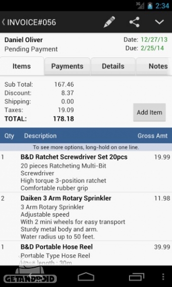 MobileBiz Pro – Invoice App 1.19.40 کامل ترین نرم افزار ساخت صورت حساب بر روی اندروید می باشد که تا کنون ارایه گردیده است . اگر می خواهید به صورت حساب ها و فاکتورهای خود سر و سامانی دهید حتما این برنامه را باید بر روی اندروید خود نصب داشته باشید . اگر در زمینه فاکتور و صورتحساب فعالیت دارید این یک برنامه ضروری برای شما است. این برنامه به درد مشاغلی چون ، پیمانکاران، مشاوران، متخصصین برق، مکانیک ها، لوله کش ها، خدمات کامپیوتر و تکنولوژی، خدمات خودرو، تعمیر و نگهداری خانه، خدمات تمیز کردن، خدمات تاسیسات، خدمات تحویل، خدمات طراحی و ... خواهد خورد. این اپلیکیشن در حال حاضر از زبان های انگلیسی، اسپانیایی، فرانسوی، ایتالیایی، آلمانی و پرتغالی پشتیبانی میکند.