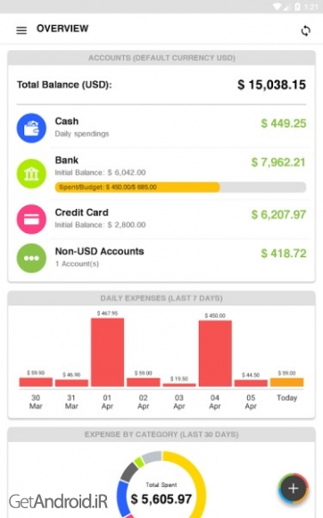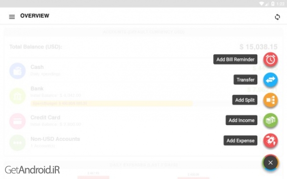 این بخش از طریق Firebase گوگل از داده های cloud بک آپ می گیرد و همزمان اطلاعات مالی تان را بین دستگاه های مختلف نگهداری می کند طوریکه همیشه داده هایتان در دستان شماست. همچنین می توانید به سرعت معاملات را ازطریق ویجت homescreen اضافه کنید