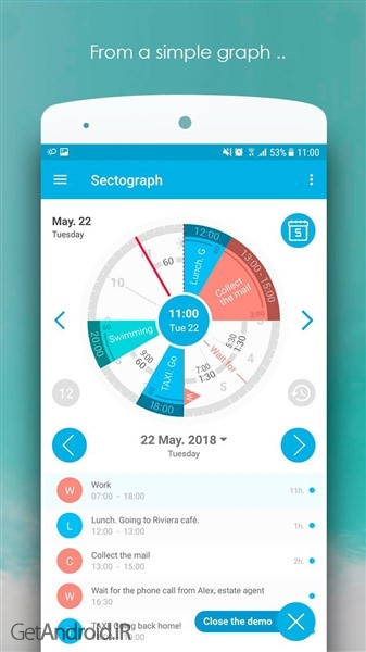 Sectograph. Day & Time planner برنامه ای کاربردی برای مدیریت و یادآوری رویدادها و کارهای روزانه است که بصورت کاملا بصری و در قالب یک نمودار دایره ای دوازده ساعته کارهای روزانه را به شما نمایش میدهد . شکل جالب این اپلیکیشن و نرم افزار مدیریت زمان اندروید شما را قادر میکند تا ساعت های مخلف روز را به راحتی مجسم کرده و برای تمامی برنامه های خود برنامه ریزی دقیقی داشته باشید و هیچکدام از کارهایتان را نیز فراموش نکنید.