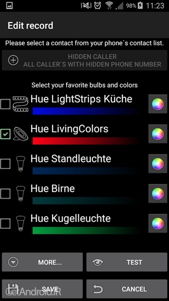 hueCall v1.3.2 گاهی پیش میاید به دلایل مختلف صدای زنگ گوشیتان را نمیشنوید. برنامه hueCall با تنظیم چراغ های رنگی فیلیپس به شما کمک میکنید متوجه تماس دریافتی تلفن خود شوید. شما حتی این اختیار را دارید که برای هر تماس یک رنگ مخصوص یا چراغ چشمک زن و حتی چندین رنگ پی در پی را انتخاب کنید. حتی میتوانید چراغ های رنگی را بر طبق سلیقه خود برای شماره های مسدود شده و ناشناس نیز تنظیم کنید.