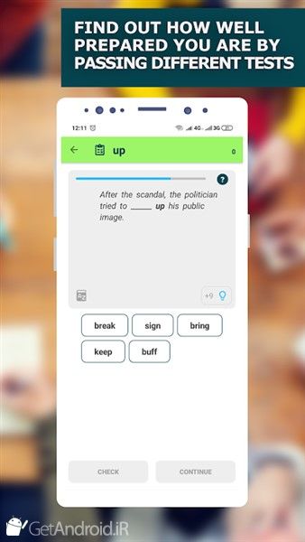 تمرین های زیادی در برنامه برای به خاطر سپردن لغات جدید وجود دارد. فلش کارت هایی با فعل عبارتی در قسمت اول درس وجود دارد. می توانید به تلفظ صحیح گوش دهید، به تعاریف و حداکثر ده نمونه استفاده نگاهی بیندازید. اگر از قبل این فعل عبارتی را میشناسید، میتوانید از آن صرفنظر کنید و به فعل بعدی ادامه دهید. پس از آن، باید آزمونی را بگذرانید تا افعال عباراتی را که قبلاً آموختهاید ادغام کنید تا ضعیفترین نقاط خود را مشخص کنید. در قسمت سوم درس، باید جمله ای را که حاوی فعل عبارتی آموخته شده است، با استفاده از کلمات به ترتیب درست تکمیل کنید. شما همچنین می توانید یک هدف برای روز انتخاب کنید و پیشرفت خود را با یک رابط کاربری راحت دنبال کنید. برای اینکه بالاترین نتایج را به دست آورید و اجازه ندهید تکرار را فراموش کنید، اعلان هایی را اضافه کرده ایم.