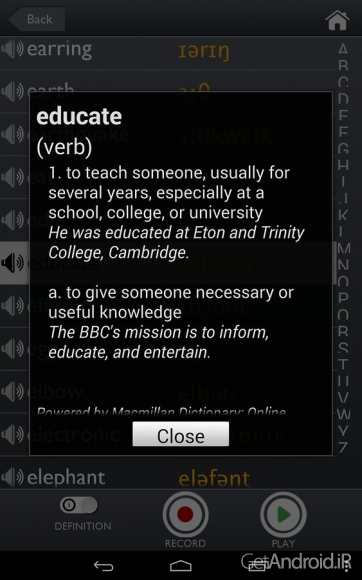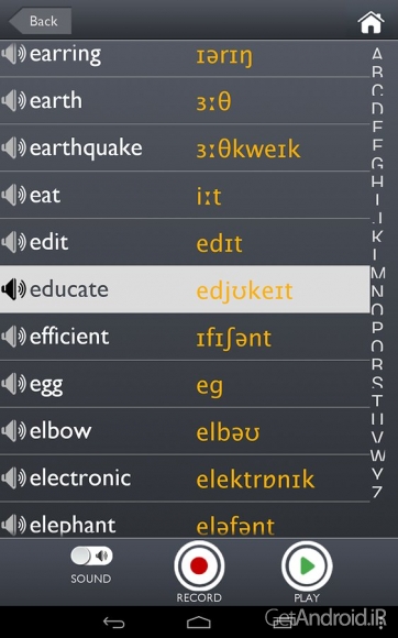 همانطور که از نامش هم پیداست اپلیکیشنی برای آموزش فونتیک و آواهای زبان انگلیسی است که توسط کمپانی دانش بنیان Macmillan Publishers Ltd منتشر شده و در دسترس کاربران مارکت اختصاصی گوگل (گوگل پلی) قرار گرفته است. این اپلیکیشن که بر اساس کتاب پرفروش 'Sound Foundations' (نوشته شده توسط Adrian Underhill) شکل گرفته به شما کمک میکند در محیطی تعاملی به فراگیری اصوات زبان انگلیسی بپردازید. همچنین میتوانید به جستجو در بین کلمات پرداخته و به تلفظ موارد و عبارت دلخواه گوش دهید. نکته جالب اینکه میتوانید تلفظ خود را ضبط نموده و با تلفظ اصلی مقایسه کنید. در کنار موارد ذکر شده میتوانید آموخته های خود را در آزمونهای موجود محک زده و اشکالات خود را مرتفع نمایید.گت اندروید این اپلیکیشن آموزش زبان انگلیسی اندروید فوق العاده مفید را به زبان آموزان عزیز تقدیم میکند.