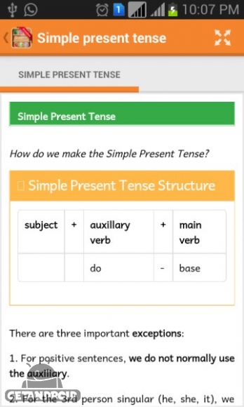 English Grammar Premium اپلیکیشن جامع و کاربردی آموزش گرامر و دستور زبان انگلیسی از طریق گوشیها و تبلتهای اندرویدی است که توسط توسعه دهنده ای بنام maxlogix منتشر شده و در دسترس کاربران مارکت گوگلپلی قرار گرفته است. با نصب این اپلیکیشن همواره مرجعی کامل از مباحث گرامر زبان انگلیسی همراه شما خواهد بود و قادر خواهید در اوقات فراغت خود و یا در زمانهای لازم به مطالعه آن بپردازید. برای راحتی هر چه بیشتر کاربران، کلیه مطالب بصورت دسته بندی شده و بترتیب الفبا معرفی شده اند؛ رابط کاربری هم به ساده ترین شکل طراحی شده تا باعث سردرگمی کاربران و یا پیچیدگی برنامه نشود. نکته جالب دیگر معرفی زمانها بصورت کامل و البته جداگانه با استفاده از مثالها و جداول گویا است که واقعا در نوع خود بسیار آموزنده و کاربردیست. در کنار اینها باید به بخش جداگانه Spoken Language هم اشاره کنیم که در آن مثالها و الگوهای پرکاربرد در مکالمه روزمره زبان انگلیسی ارایه و معرفی شده اند تا شما را هر چه بیشتر با نکات لازم آشناتر کنند.