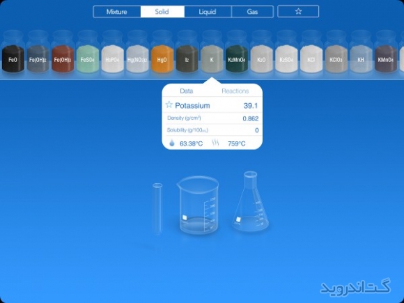 آزمایشگاه شیمی قابل حمل شما است. این تنها آزمایشگاه شیمی مجازی برای تبلت ها جهت انجام آزمایش های شیمی، کشف واکنش های شیمیایی با ابزار آزمایشگاهی متفاوت می باشد. با استفاده از این برنامه می توانید تمامی آزمایش های مربوط به علم شیمی و مواد شیمیایی را انجام داده و حتی آزمایش های خطرناک را در محیط این نرم افزار، بدون خطر انجام دهید. مخلوط کردن مواد شیمیایی را با ریختن آنها در لیوان های آزمایشگاه یا لوله های آزمایش امتحان کنید. شما همچنین می توانید مواد شیمیایی را با یک چراغ بونزن، و یا قرار دادن یک قطعه از سزیم در آب حرارت دهید.برخی از ویژگی های برنامه Chemist -– Virtual Chem Lab اندروید: