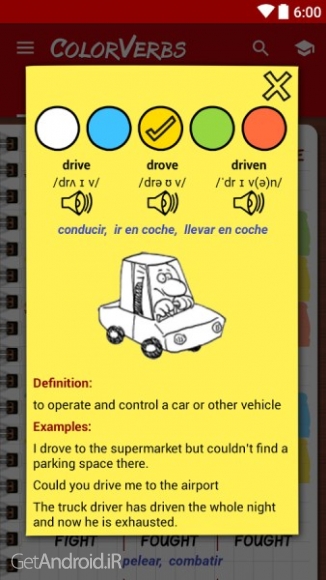نرم افزار افعال بی قاعده زبان انگلیسی English Irregular Verbs PRO یک برنامه کامل برای یادگیری معنی افعال به شکل مصور می باشد که یک لیست از 200 فعل بی قاعده زبان انگلیسی را فراهم میکند که کابرد آنها در جملات و زمان های مختلف این افعال است. هر فعل شامل نمونه (تعاریف به عنوان مثال، جملات، عکس، تلفظ صوتی و رونوشت آوایی) می باشد. این برنامه اندروید و جالب محیطی کاملا انگلیسی داشته اما کاربری آن بسیار ساده است.
