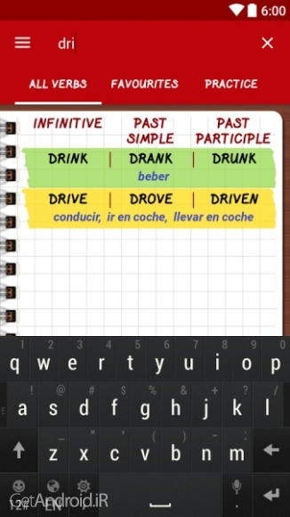 - وارد سایت گت اندروید شده و از بخش جستجو عبارت "English Irregular Verbs PRO" را تایپ کنید
