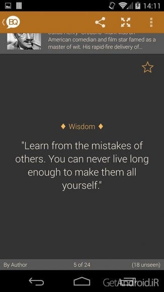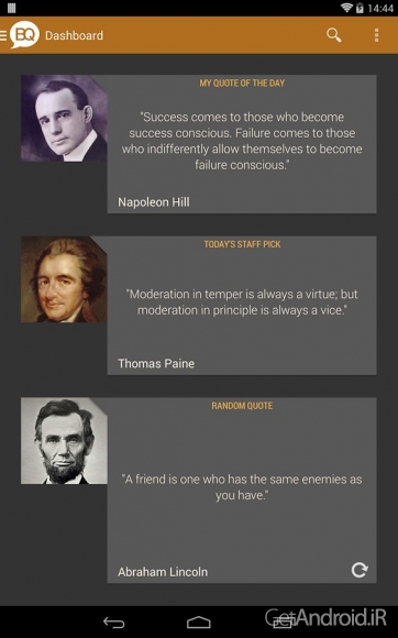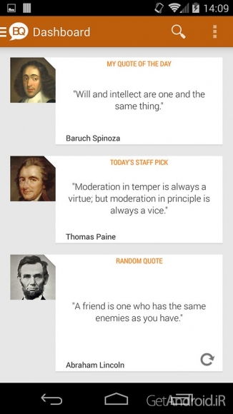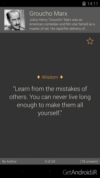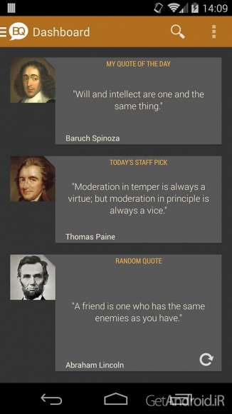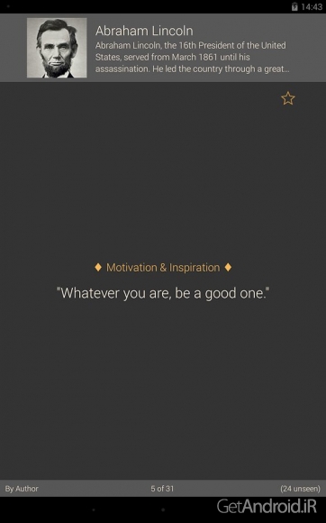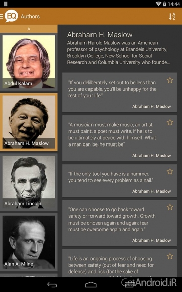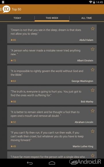 یکی از برترین اپلیکیشنها در زمینه گردآوری سخنان مشاهیر جهان در پلتفرم اندروید است که توسط توسعه دهنده ای بنام lammar منتشر شده و در دسترس کاربران قرار گرفته است. با نصب این برنامه خواهید توانست به بیش از 3600 سخن برگزیده از 260 چهره معروف و شناخته شده - از فیلسوفان و نویسندگان گرفته تا دانشمندان علوم مختلف - دسترسی پیدا کرده و از مطالعه آنها لذت ببرید. سازندگان این اپلیکیشن در مورد رابط کاربری آن سنگ تمام گذاشته و محیطی گویا و البته زیبا را برای کاربران فراهم کرده اند. چنانچه به سخنان زیبا از افراد شناخته شده علاقه مند هستید، پیشنهاد میکنیم این برنامه را بر روی دستگاه اندرویدی خود داشته باشید؛ البته باید به این نکته اشاره کنیم که سخنان به زبان انگلیسی هستند و برای درک آنها باید با زبان انگلیسی آشنا باشید.ویژگیهای برنامه Brilliant Quotes & Quotations: