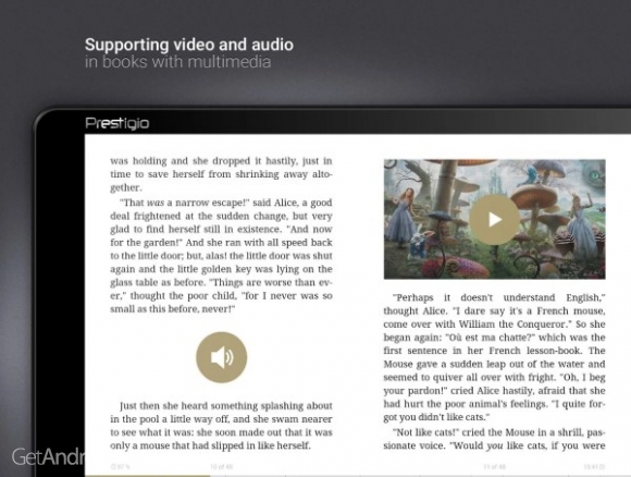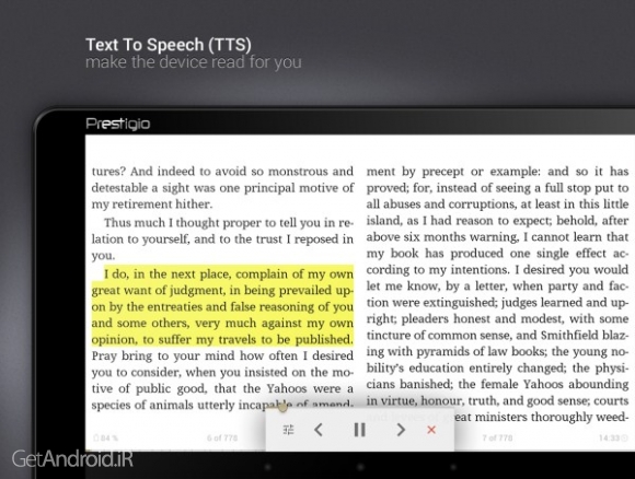 را بدون اغراق میتوان بهترین نرم افزار کتاب خوان با قابلیت تبدیل متن و نوشتار به گفتار در مارکت اندروید دانست. این برنامه با دارا بودن بیش از 25 زبان مختلف و فرمت متن چند گانه علاوه بر پشتیبانی کتابهای متنی با فرمت های epub ، djvu ، html ، fb2 ، fb2.zip ، txt ، pdf ، mobi ، epub3 میتواند کتاب های صوتی را نیز برایتان پخش کند. شاید گاهی اوقات از خواندن متن های طولانی و متعدد خسته شوید ، نگران نباشید. زیرا این اپلیکیشن با استفاده از قابلیت Text-To-Speech متن کتاب را به صوت تبدیل کرده و برایتان با صدای بلند خواهد خواند. این برنامه همچنین از قابلیت پخش کتاب های صوتی و همچنین پخش فیلمهای موجود در کتاب ها نیز پشتیبانی میکند. این برنامه برای اولین بار در ایران و در میان سایت های فارسی زبان توسط گت اندروید منتشر شده است.برخی از ویژگی های برنامه eReader Prestigio: Book Reader Full اندروید :