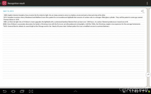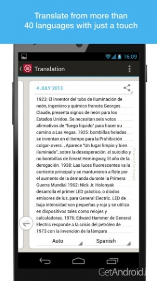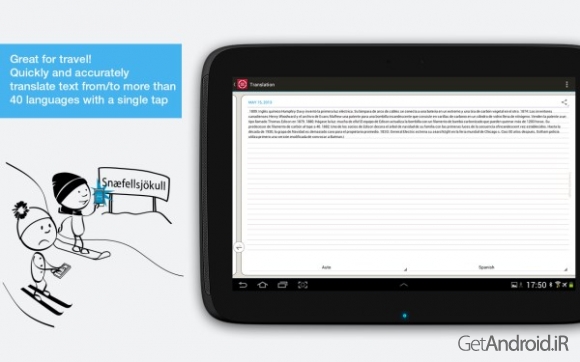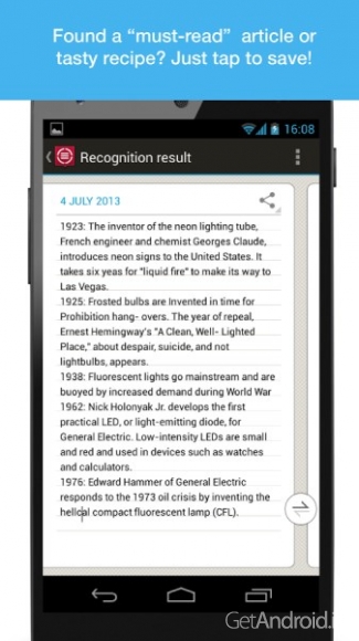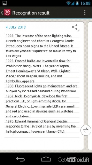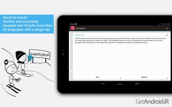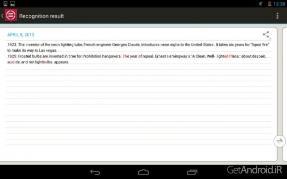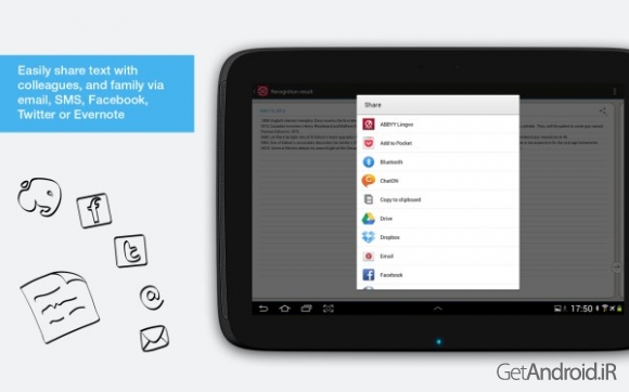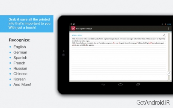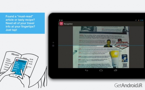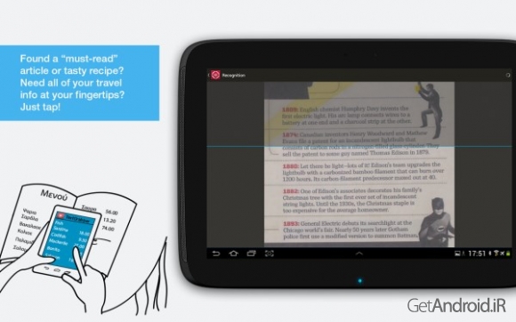 با استفاده از دوربین دستگاه اندروید، به راحتی قطعه های متن را از انواع منابع چاپ شده استخراج می کند. شما می توانید اطلاعات چاپ شده را رقمی(digitize) کنید و آن را در هر مکان و هر زمان به هر یک از بیش از 40 زبان ترجمه کنید. آیا می دانستید ترجمه کردن متونی که در روزنامه ها ، مجلات و … می خوانید بسیار ساده تر از آنی هست که فکرش را می کردید ؟ فقط یک عکس از متن بگیرید، و شما می توانید بلافاصله آن را ویرایش و ترجمه کنید، از طریق ایمیل و SMS به اشتراک بگذارید، و یا آن به طور مستقیم به یک برنامه دیگر نصب شده بر روی دستگاه خود انتقال دهید – شبکه های اجتماعی، سرویس های ذخیره سازی آنلاین، و غیره. با استفاده از نرم افزار ABBYY TextGrabber + Translator می توانید دوربین دستگاه اندروید خود را به یک مترجم قدرتمند تبدیل کنید . این برنامه با گرفتن عکس از روی متون چاپ شده می تواند آنها را با استفاده از فناوری OCR به داده های دیجیتال تبدیل کرده و آنها را هر زبانی که می خواهید ترجمه نمایید . بدین ترتیب تا گرفتن متن ترجمه شده خود تنها با چند کلیک فاصله داشته و می توانید آنها را پس از ترجمه با استفاده ایمیل یا SMS به اشتراک بگذارید . توجه داشته باشید هنوز قابلیت تشخیص دادن کلمات پارسی در این برنامه گنجانده نشده است اما در بخش ترجمه می توانید خروجی را روی این زبان شیرین قرار دهید . لازم به ذکر است که این برنامه برنده جایزه سوپر استار در رده “Text Input” در Mobile Star Awards می باشد.با TextGrabber + Translator شما می توانید موارد زیر را اسکن و ترجمه کنید: