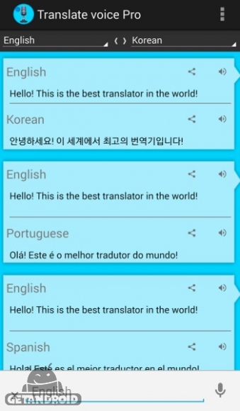 نرم افزار حرفه ای ترجمه صدا و گفتار می باشد که از از تمام زبان های زنده دنیا و مخصوصا زبان شیرین فارسی نیز پشتیانی میکند (برنامه ورودی زبان فارسی دارد ولی خروجی به فارسی ندارد) . شما می توانید یک مکالمه در هر زبان را با کمک مترجم صوتی نگه دارید، متون مختلف را ترجمه کنید و از دکمه برای تلفظ برنامه استفاده کنید. زبان ها را به سرعت و به سادگی یاد بگیرید، زبان خود را به صورت کتبی یا گفتاری از زبان انتخابی خود برای تلفظ بیان کنید، در 80 زبان 44 زبان متن و صدای گفتاری. همچنین تصحیح املایی، پیشنهاد کلمه، حفظ تاریخچه با آخرین ترجمه های خود، اشتراک گذاری متون به طور مستقیم به پیام های فوری، شبکه های اجتماعی ، ایمیل، جستجو، یادداشت ها و برنامه های دیگر نصب شده شما از دیگر ویژگی های این برنامه است.برخی از ویژگی های برنامه Translate voice – Pro اندروید :