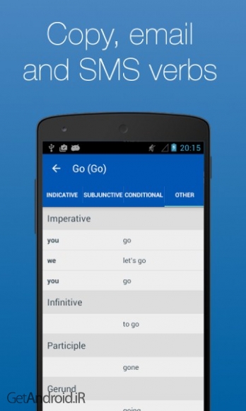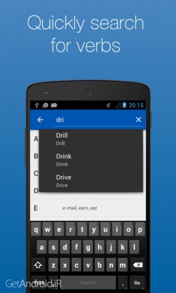 English Verb Conjugator Pro یک برنامه کامل برای کسانی است که قصد آموزش زبان انگلیسی را بطور کامل دارند. این نرم افزار تقریبا 2000 افعال انگلیسی را در 20 زمان مختلف برای شما صرف میکند. این اپلیکیشن دارای ناوبری بسیار ساده بوده و برای پیدا کردن کلمات میتوانید از بخش جستجوی آن اقدام کنید و در عرض کمتر از چند ثانیه فعل مورد نظر خود را بیابید. شما میتوانید کلمه و فعل مورد نظر را کپی کرده و توسط ایمیل و اس ام اس آنرا به دوستان خود ارسال کنید. این برنامه بسیار پرکاربرد می باشد و گت اندروید به افراد مبتدی دانلود آنرا پیشنهاد میکند. برنامه English Verb Conjugator Pro نیازی به اتصال به اینترنت نداشته و تمامی داده ها بصورت محلی ذخیره میشوند.