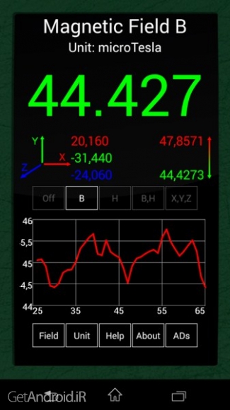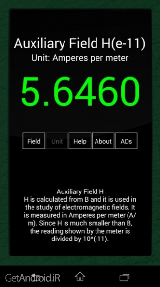 این برنامه از سنسور مغناطیسی (قطب نما) گوشی خود را و نمایش خواندن با یک خط از LED و یک متر سوزن کلاسیک استفاده میکند. شما می توانید بین واحد های اندازه گیری (uTesla و گاوس) تغییر دهید و تغییر وسیعی از اندازه گیری تنظیمات ایجاد نمایید.