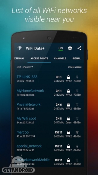 3) تب Acces points list – لیستی از تمام نقاط دسترسی شبکه قابل رویت به دستگاه شما. توصیف یک شبکه با نام، کانال، امنیت و قدرت سیگنال در هر سطر. شما می توانید این لیست را با هر صفت مرتب کنید و شبکه های در اطراف خود را پیدا کنید!