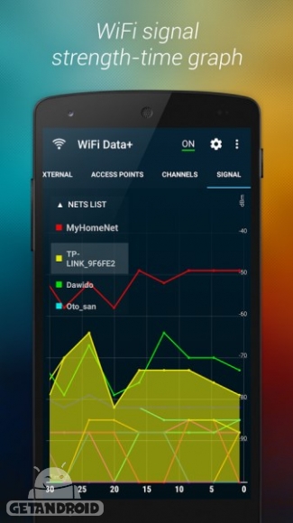 5) تب Signal – نمودار قدرت سیگنال شبکه وابسته به زمان. لیست کوچک هر شبکه قابل مشاهده را نمایش می دهد. شما می توانید مهم ترین شبکه را از لیست انتخاب کنید و چگونگی تغییر قدرت سیگنال آن در زمان را تماشا کنید.