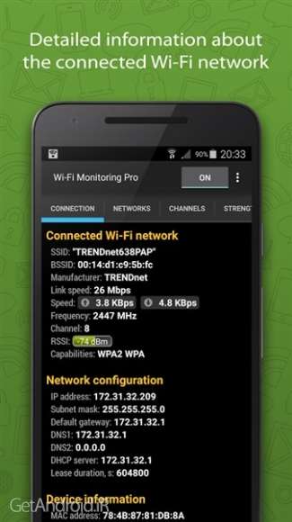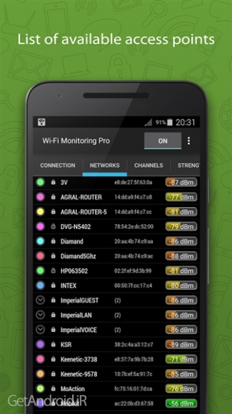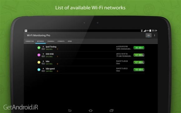 یک مانیتور شبکه قدرتمند برای گوشی های اندروید است که به شما کمک می کند تا وضعیت شبکه های WiFi را با جمع آوری داده ها در مورد پارامترهای آن مشاهده کنید ، شما توسط این برنامه میتوانید افزار متصل به وای فای و شبکه وایرلس را مشاهده کرده و دسترسی آنها را قطع کنید. بخش «اسکن شبکه» جستجوی دستگاههایی متصل به شبکه WiFi را انجام می دهد و این اطلاعات را به عنوان یک لیست نشان می دهد.شبکه ها اجازه می دهد تا تمام شبکه های فای دسترسی را با پارامتر های زیر مقایسه کنید: نوع شبکه، تولید کننده، سطح سیگنال، پروتکل امنیتی. نقاط دسترسی همان شبکه را می توان با هم گروه بندی کرد.