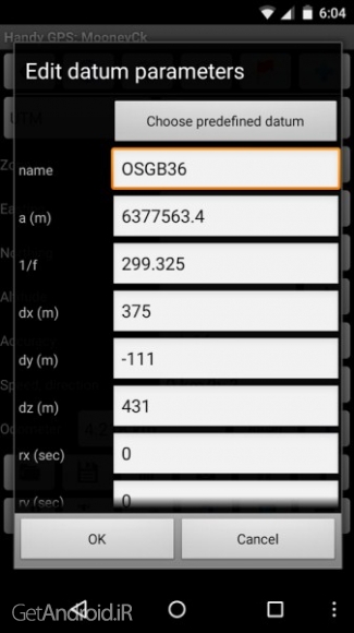 ✤ datums نقشه های رایج مانند NAD83 (US)، OSGB36 (UK)، NZTM2000 (NZ)، SAD69 (جنوب امریکا) و ED50 (اروپا) را می توان از صفحه داده سفارشی انتخاب شده، یا شما می توانید داده های خود را با مشخص بیضی آن پیکربندی و تغییر پارامترها.