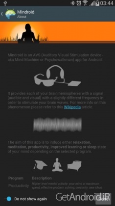 Mindroid یکی از جدیدترین روش های ایجاد آرامش است که با تحریک های شنوایی و بصری نیمکره های مغز صورت می گیرد. این یک برنامه مفید صدا درمانی برای علاقمندان به یوگا، مدیتیشن و ریلکسیشن است. این نرم افزار که باید با هدفون استفاده شود می تواند امواج صوتی خاصی را تولید کند که در موقعیت های مختلف عملکرد مغز را بهبود دهد. این برنامه اندروید با در قالب متون علمی، کاربردی بودن این روش ها را توضیح داده است و با استفاده از تحریک های بصری و شنوایی خود شما را به دنیای آرامش دعوت می کند. این برنامه همچنین برای خواب بهتر توصیه می شود. این نرم افزار از طریق پخش اصواتی با فرکانس معین، امواج مغزی را با توجه به درخواست اولیه شما اصلاح کرده و آن حالتی را که در پی آنید به شما القا مینماید.