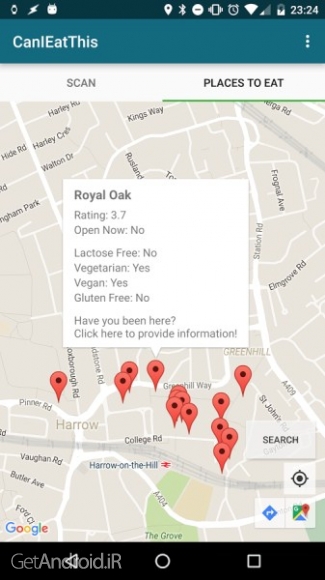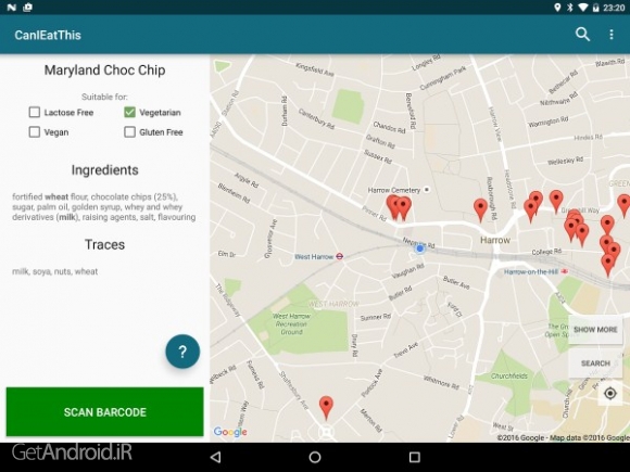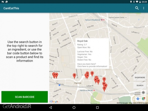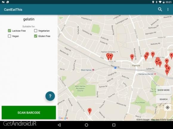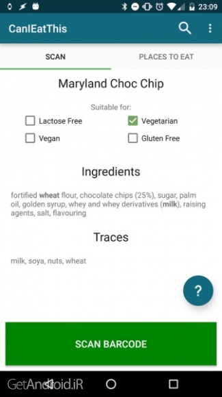 به سادگی و بطور کارایی به شما این امکان را می دهد محصولی را اسکن و بررسی کنید ، ترکیب غذای خاصی را جستجو کنید و به شما این اطلاعات را می دهد که آیا می توانید آن محصول را استفاده کنید یا خیر. به سادگی دگمه Scan Barcode را فشار دهید. این اپ سازگاری محصول را به شما نشان می دهد. دیگر نیازی نیست لیست های کوچک ترکیبات را جستجو کنید. و یا در قسمت بالا در سمت راست دگمه جستجو را فشار دهید و ترکیبات غذا را جستجو کنید.مکان هایی برای خوردن