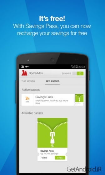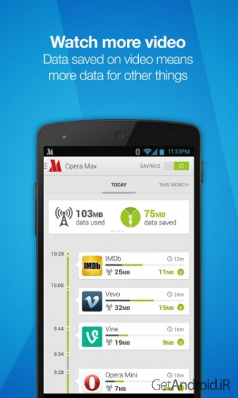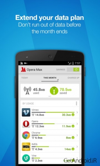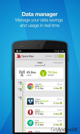 یک برنامه اندروید برای صرفه جویی داده گوشی شما است که پلن داده شما را افزایش می دهد. Opera Max یک روش رایگان برای صرفه جویی دیتا روی موبایل شما می باشد. Opera Max ویدئو، تصاویر و عکس های تقریبا تمام برنامه های گوشی موبایل شما را فشرده سازی می کند. اگر شما از یک طرح اینترنت محدود استفاده می کنید و بدون مصرف بیش از حد محدودیت ماهانه خود، زمان بیشتری برای اشتراک گذاری ویدیو و عکس در برنامه های اشتراک گذاری می خواهید، Opera Max می تواند داده های ورودی به گوشی شما را تا 50% فشرده سازی کند. از حالا پلن اینترنت 1 گیگابایتی شما تا 50% بیشتر می ماند.همچنین ببینید: دانلود سامسونگ مکس Samsung Max برنامه کاهش مصرف اینترنت دیتا اندروید