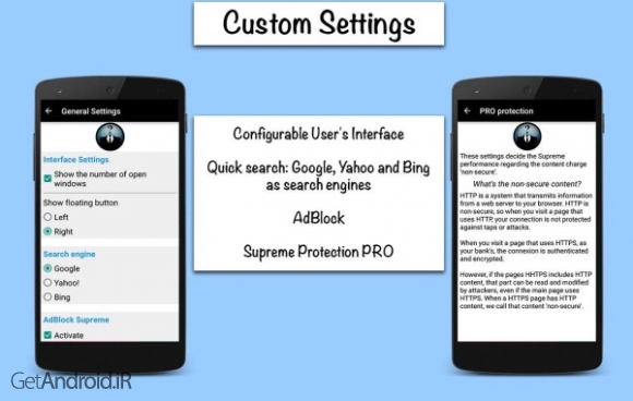 برنامه مرورگر ناشناس اندروید Browser Incognito - Supreme v1.1 build 3 یک مرورگر وب جدید برای حفظ امنیت و ناشناس ماندن شما در اینترنت می باشد که دقایقی پیش در مارکت اندروید منتشر شد و تصمیم گرفتیم برای اولین بار آنرا در میان سایت های ایرانی و فارسی زبان طبق معمول همیشه در گت اندروید معرفی کنیم. این یک مرورگر کاربردی برای کاربران Google Play می باشد. این یک مرورگر اینترنت مطلوب برای مرور وب سایت ها ، سایت های دوستیابی ، سایت های پزشکی ، بررسی مطالب فیس بوک ، تماشای یک ویدئو یا هر چیز مشابه دیگری در اینترنت می باشد. هر باری که شما از مرورگر خارج میشوید تمام ردپاهای شما پاک خواهد شد. از جمله تاریخچه ، کوکی ها و سشن ها .