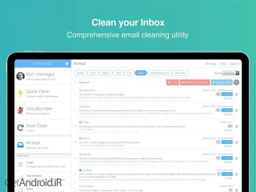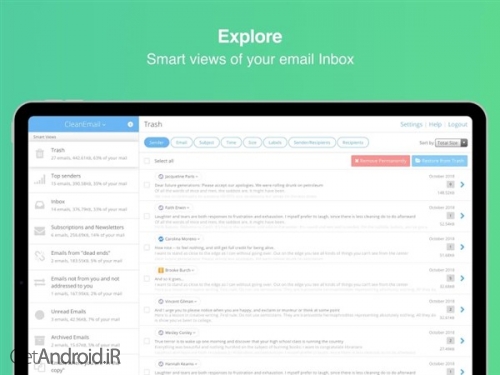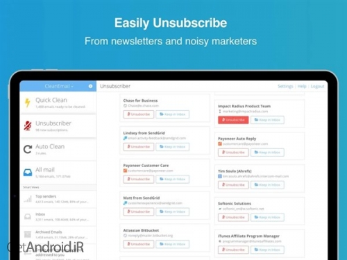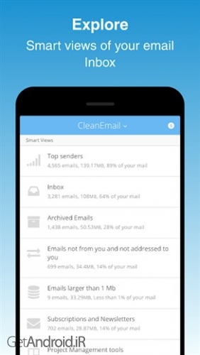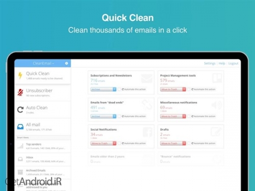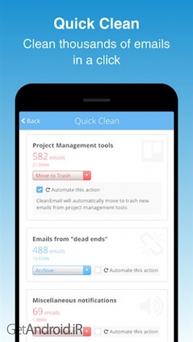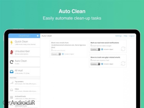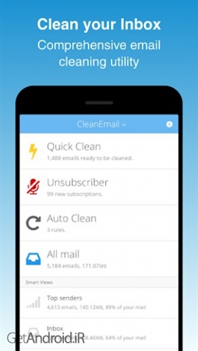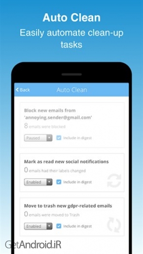 بهترین پاک کننده و سازمان دهنده ایمیل می باشد که به شما قدرت کنترل صندوق ورودی تان را می دهد. این برنامه مدیریت ایمیل اندروید می تواند به راحتی به صفحه اصلی شما متصل شود و می تواند برای شناسایی صندوق پستی خود استفاده شود. همچنین به دنبال آن یک قوانین و فیلترهای قدرتمندی به منظور کارایی بخش صندوق پستی ایجاد شده است و به شما اجازه می دهد تا به سرعت ایمیل های خود را شناسایی کنید و صندوق پستی خود را با چند کلیک پاکسازی کنید.با Clean Email می توانید: