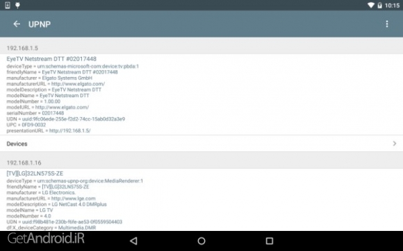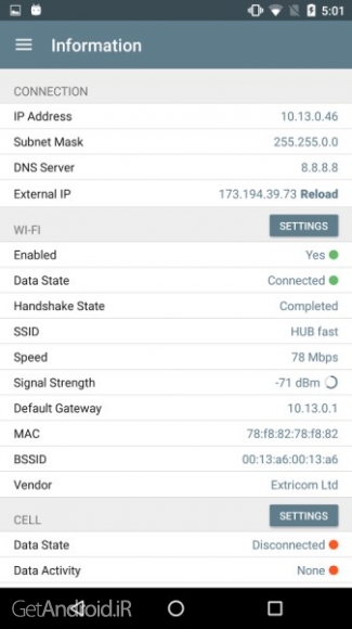 - همراه (3G، LTE) اطلاعات شبکه مانند آدرس IP، قدرت سیگنال، ارائه دهنده شبکه، MCC، MNC، و غیره