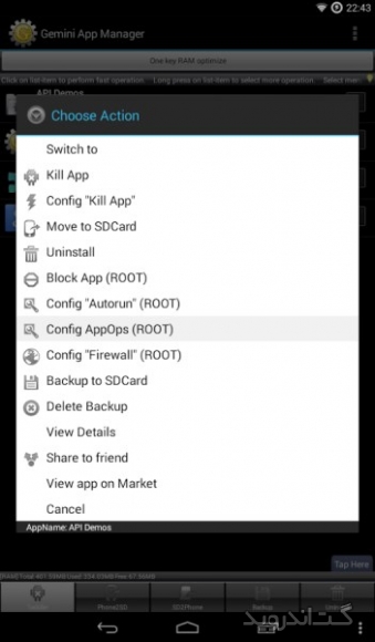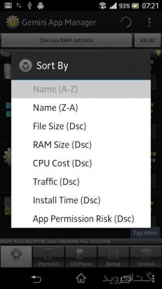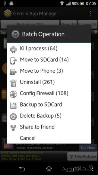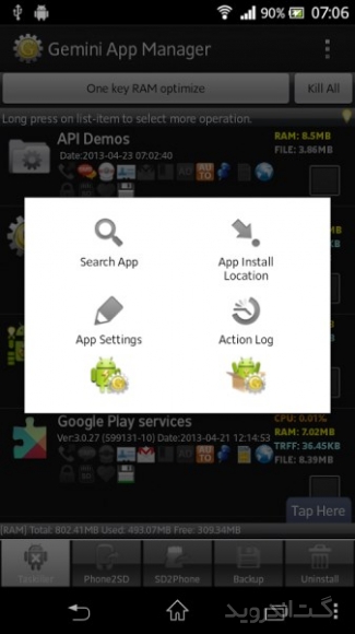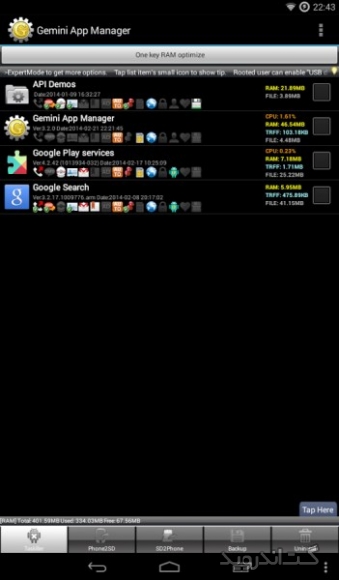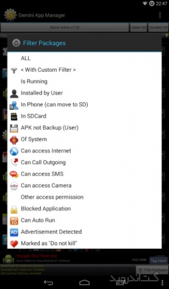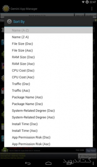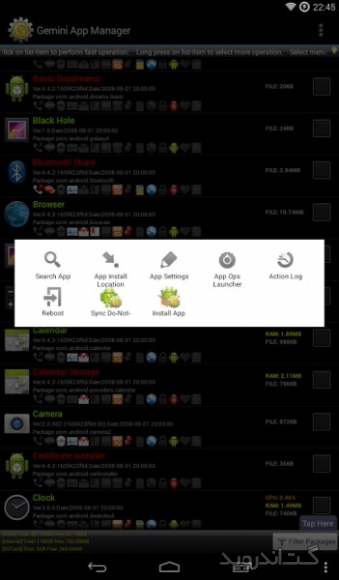 نرم افزاری سریع و قدرتمند برای مدیریت برنامه هایی است که بر روی گوشی یا تبلت اندرویدی خود نصب کرده اید . این برنامه علاوه بر ویژگی اصلی خود دارای برنامه های جانبی دیگری نیز می باشد . Risk indication, app Autorun Control(ROOT), Task Killer, Move app 2 SD card(Android 2.2 or later), Uninstaller, Backup apks to SD card از جمله ابزارهایی هستند که برای تکمیل قابلیت های این برنامه قرار گرفته اند . از جمله امکانات این نرم افزار اندروید می توان به مدیریت اتوران (فعال یا غیر فعال کردن اتوران برنامه ها)، انتقال بازی یا نرم افزار از حافظه داخلی به خارجی به صورت تک تک و گروهی، حذف و گرفتن BackUp از بازی و نرم افزار، امکان بلوک کردن فایل ها در گوشی های روت شده و … اشاره کرد. همچنین این برنامه دارای ویژگی هایی نظیر نمایش اطلاعات بازی، نرم افزار دیوار آتش، مشاهده برنامه در مارکت اندروید، مرتب سازی برنامه ها و … می باشد. شما با داشتن این پکیج قدرتمند می توانید دستگاه اندرویدی خود را همیشه در بالاترین سطح عملکرد نگاه دارید .برخی از ویژگی های برنامه Gemini App Manager اندروید :