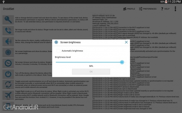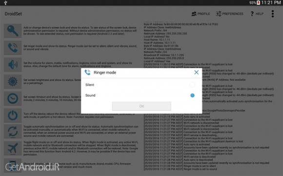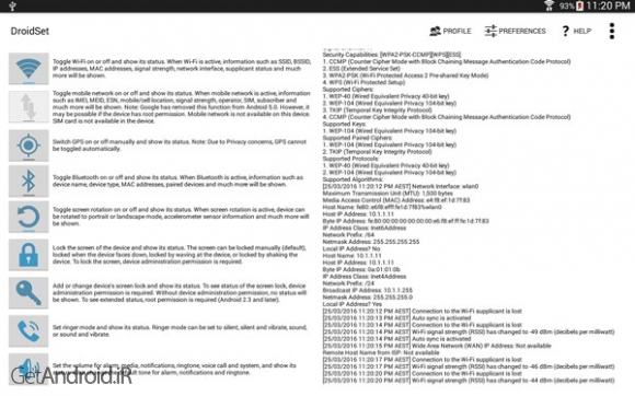 برنامه DroidSet Pro 2.8.2 با ارائه ی قابلیت سریع به شما اجازه میدهد تنظیمات دستگاه اندرویدی خود را مدیریت کنید. شما به راحتی و با لمس یک دکمه میتوانید وای فای، شبکه تلفن همراه، بلوتوث، حالت پرواز و غیره را فعال یا غیر فعال کنید. هرگاه شما این قابلیت رافعال کنید برخی اطلاعات مربوط به ان به شما ارایه خواهد شد. این برنامه با ارایه ی بخش ١_مشخصات ٢_تنظیمات ٣_راهنما ٤_تازه چه خبر ٥_درباره ی به شما در گت اندروید استفاده ی اسان از این برنامه کمک خواهد کرد. در بخش مشخصات میتوانید چندین پروفایل را تنظیم کنید، در بخش تنظیمات نیز میتوانید زبان، تم و ایکون برنامه و بسیاری موارد دیگر را تنظیم کنید. این برنامه در بسیاری زبان ها از جمله فارسی ، انگلیسی، ایتالیایی، پرتغالی و بسیاری دیگر به شما ارایه شده است. به علاوه بدون نگرانی از هیچگونه نرم افزار مخرب، بد افزار ، ابزارهای تبلیغاتی مزاحم و غیره میتوانید از ان استفاده کنید.