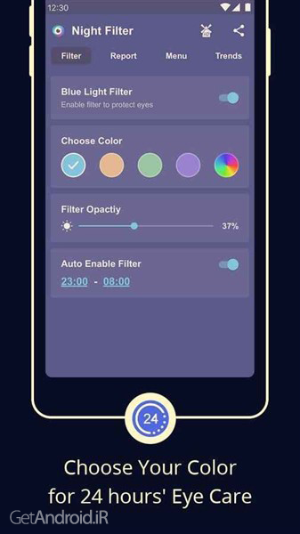 یک برنامه مدیریت صفحه اندروید که می تواند از چشمان تان در زمان کار با گوشی های موبایل که نور آبی رنگ تولید می کنند ، مراقبت نماید. اگر عادت دارید قبل از خواب با گوشی خود کار کنید، مراقب باشید! نور آبی رنگ صفحه نمایش می تواند ریتم شبانه روزی شما را مختل نموده و واقعا بر خواب شما تاثیر بگذارد. با این حال ، با کمک فیلتر شفاف درون اپلیکیشن Blue Light Filter برای مراقبت از چشمان شما در برابر نورهای گوشی طراحی شده است. همین حالا می توانید در زمان شب یک تجربه بهتر و سالم تری را در کار با صفحه نمایش موبایل داشته باشید. این برنامه نور گوشی تان را با حالت فوق العاده شب سازگار نموده و می تواند از خستگی چشمان تان تا حد زیادی کم کند و در نتیجه خواب بهترین را نیز تجربه خواهید کرد. برنامه فیلتر آبی رنگ می تواند در برابر نور صفحه نمایش برای مراقبت از چشمان تان کمک کند با تنظیم صفحه نمایش به رنگ طبیعی و فیلتر کردن نور مضر آبی ، به خوبی یک محافظت در مقابل چشم و صفحه گوشی باشد. به راحتی می توانید یک بار آن را اعمال کرده و بر روی صفحه های تان تغییرات انجام دهید. این برنامه زمانی که مشغول خواندن کتاب در شب ، تایپ کردن یا بازی کردن هستید ، بسیار ضروری است. نور آبی رنگ طیف وسیعی از دستگاه های الکترونیکی شامل انواع فن آوری ها از جمله رایانه ها ، تلفن های هوشمند ، تلویزیون ها و چراغ ها را ناشی می شود. قرار گرفتن طبیعی در معرض نور آبی در ساعات پر نور روز باعث تقویت انرژی ، هوشیاری و خلق و خوی افراد می شود. اما قرار گرفتن در معرض امواج در طول شب از طریق دستگاه های صفحه نمایش انتقال دهنده می تواند ریتم شبانه روزی شما را مختل کند و باعث ایجاد تأثیرات مختلف سلامتی از جمله اختلال در برنامه خواب معمولی شود.مراحل کار با برنامه Blue Light Filter اندروید :