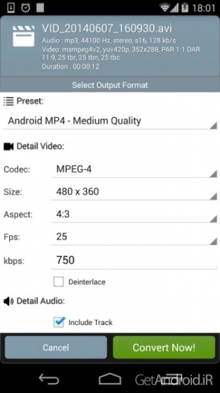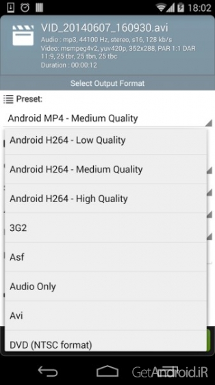برنامه ای جهت تبدیل تمام فایل های ویدئو و موسیقی خود بر روی دستگاه اندروید می باشد. همه فایل های Mp4، FLV، AVI، MKV، MP3، FLAC، WMA، OGG، AAC، M4A، AC3، APE، WAV خود را تبدیل کنید. همه فرمت های اصلی پشتیبانی می شوند. فرمت خروجی بسیار قابل تنظیم: فرمت خروجی را با تنظیم حجم، کدک، نسبت ابعاد، فریم در ثانیه، فرکانس، میزان ارسال بیت و … به طور کامل پیکربندی کنید. ویدئوها خود را تقسیم کنید و برخی از قطعات انتخاب شده را استخراج کنید.فرمت های تبدیل شده (برای مثال) :