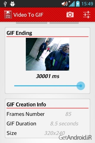 به شما امکان میدهد تا ویدیوهای خود را به فرمت GIF تبدیل کرده و از آنها انیمیشنهایی زیبا و بامزه ایجاد کنید. میتوانید یک ویدیو را از گالری انتخاب کرده و یا با استفاده از دوربین فیلم بگیرید، سپس با تعیین شروع و پایان، یک محدوده زمانی را انتخاب کرده و پیشنمایش را برای زمان انتخاب شده مشاهده کنید. GIFهای ایجاد شده در پوشه Pictures/VideoToGif ذخیره میشوند. برای اطلاعات بیشتر Menu -> About را فشار دهید. در این برنامه میتوانید ۴ فاکتور کیفیت، رزولوشن، محدوده زمانی و تعداد فریمها را مشخص کنید. توجه کنید که شما در حال استفاده از دستگاه موبایل هستید و حافظه و منابع دیگر محدود هستند. شما می توانید مشخصات GIF در پایان پنجره اصلی ببینید. وقتی GIF ایجاد شد برای دیدن آن در گالری، روی آن لمسی کنید و نگه دارید.ما تنظیمات زیر را پیشنهاد می کنم (البته به دستگاه شما بستگی دارد):
