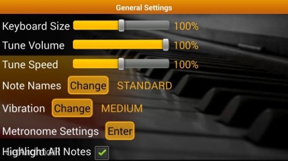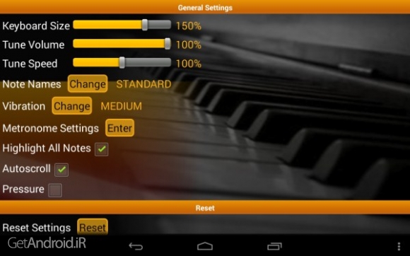 ✤ پیانو بسیار قابل تنظیم - چند لمسی، glissando، برجسته، بر اساس نام نت ها (استاندارد و یا سلفژ، صفحه کلید قابل اندازه بندی مجدد که برای تمام دستگاه ها و تبلتها مناسب است).
