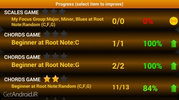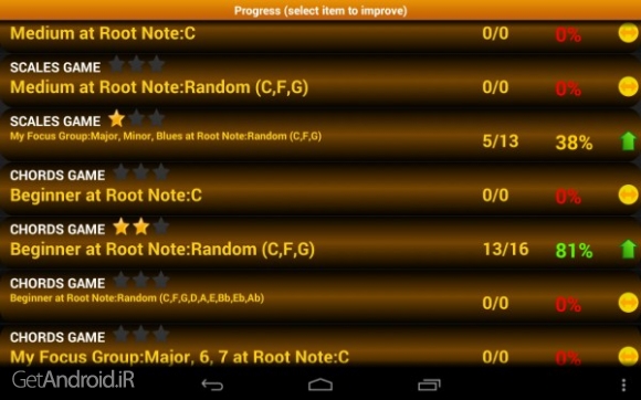 ✤ مقیاس ها و آکورد بازی برای تست دانش. پیشرفت از طریق سطوح برای بررسی میزان پیشرفت.