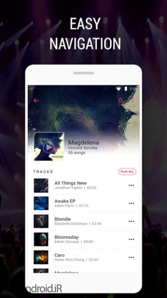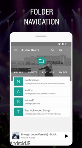 یك پخش كننده ی صوتی زیبا و كاربر پسند با ویژگیهای بسیار قدرتمند و طراحی منحصر به فرد میباشد. این برنامه به صورت هوشمند و در عین حال ساده برای بهترین تجربه ی كاربر طراحی شده است. برخلاف دیگر پخش كننده ها، میتوانید تمام موزیك ها را در یك صفحه داشته باشید و نیازی به بازگشت برای پخش موزیك بعدی ندارید. توجه داشته باشید كه این پخش كننده انلاین نمیباشد و برای دانلود اهنگ از اینترنت كاربردی ندارد و فقط برای اهنگهای ذخیره شده در حافظه ی گوشی و كارت SD استفاده میشود.ویژگیهای كلیدی برنامه Music Player - Audio Beats اندروید :