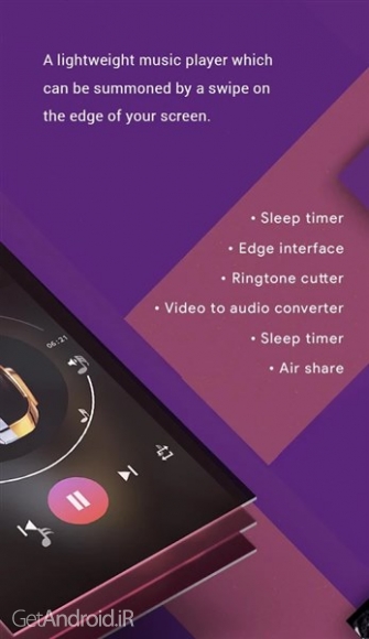 S8 Edge Music Player 7.0.1.1 b88 یک موزیک پلیر فوق العاده با امکانات فراوان برای گوشی های اندرویدی می باشد که در کنار صفحه شما به نمایش در می آید و رابط کاربری فوق العاده ای را به نمایش می گذارد. رنگ برنامه با افکت گرادیانت دائما تغییر می کند و محیطی مدرن و شیک را به کاربر ارائه می نماید. شما می توانید صداهای پخش شده توسط برنامه را کاملا واضح و بلندتر از دیگر برنامه ها بشنوید. شما می توانید از ویژگی ادج برنامه استفاده نمایید، با استفاده از این قابلیت، کافیست دست خود را از کنار صفحه بکشید تا برنامه باز گردد. امکان اضافه کردن موسیقی های محبوب به برنامه وجود دارد، آن ها به شکل پلی لیست در می آیند و در هر زمانی قابل پخش می باشند. امکان دیدن موسیقی ها براساس نوازنده یا آلبوم وجود دارد. امکان بریدن موسیقی ها و استفاده از آن ها به عنوان رینگتون وجود دارد.