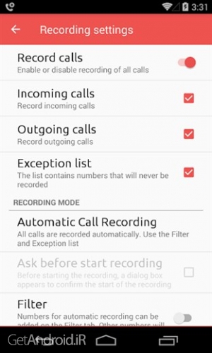 به طور جداگانه در برنامه، می توانید مشخص کنید کدام تماس برای ضبط، ورودی یا خروجی یا هر دو.