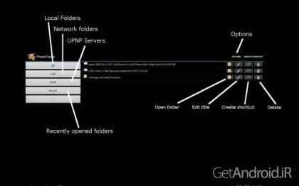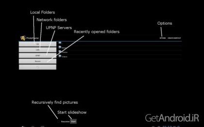 * انتخاب یک پوشه محلی، یک شبکه اشتراکی samba/windows (پشتیبانی از دسترسی ناشناس و تصدیق شده) یا استفاده از یک سرور UPNP برای نمایش عکس ها