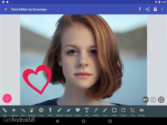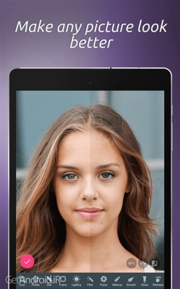 یک نرم افزار عالی برای ویرایش تصاویر سلفی و روتوش صورت می باشد. شما به وسیله این برنامه میتوانید چین و چروک ها ، جوش ها ، خال ها را از بین برده ، چشمها یا گونه خود را درشت تر کنید. شما میتوانید روشنایی و کنتراست تصویر خود را کمتر یا بیشتر کرده و تصویر خود را مانند یک ویرایشگر حرفه ای تصویر ، ویرایش کنید.صورت خود را به صورت حرفه اي آرايش كنيد: