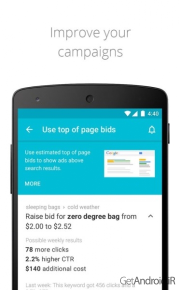 برنامه Google AdWords v1.11.1 به شما کمک می کند از هر نقطه، با استفاده از گوشی هوشمند اندروید خود با کمپین های تبلیغاتی خود متصل بمانید. شما به راحتی می توانید، عملکرد تبلیغات خود را با این همراه ساده شده مشاهده کنید. بنابراین کمپین های تبلیغاتی خود را به صورت هموار جاری خواهید داشت. توجه داشته باشیدکه این برنامه فقط برای مشتریان AdWords است.