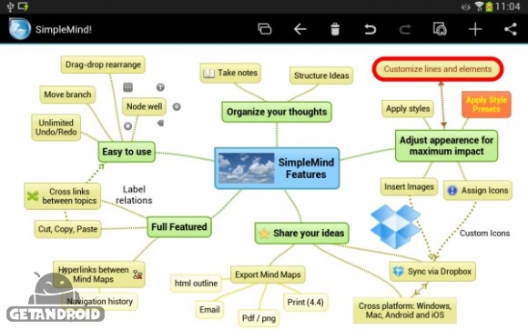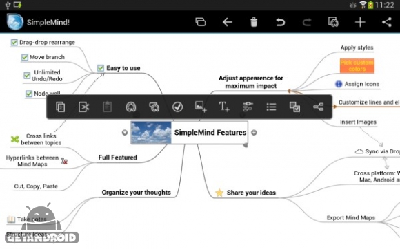 ابزاری برای رسم نقشههای ذهنی ، مرتب سازی و سازمان دهی ایدهها ، نوشتهها ، فعالیتها ، طوفان های ذهنی و کارهای روزمره یا پروژه هاست که از طریق نمودارهای درختی و الگوهای دیگر به فرآیند برنامه ریزی کمک می کند . SimpleMind یکی از بهترین نرم افزار ها برای ترسیم تراوش های ذهنی است که به سادگی شما را قادر می سازد تا ایده ها و برنامه های خود را به تصویر بکشید .برخی از ویژگی های برنامه SimpleMind mind mapping اندروید :
