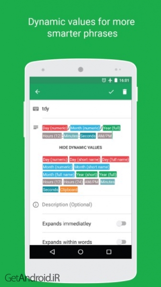 یک برنامه گسترش متن است که به شما کمک می کند که به شما کمک میکند در هنگام تایپ ، مقدار زیادی در وقت خود صرفه جویی کنید. اینکار با اختصاص دادن کلید های میانبر به متن هایی که اغلب از آنها استفاده میکنید قایل انجام است.برخی از ویژگی های برنامه Texpand Pro - Text Expander اندروید :