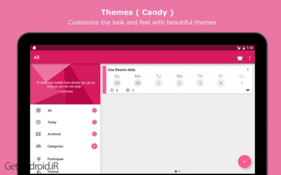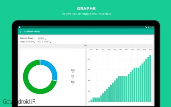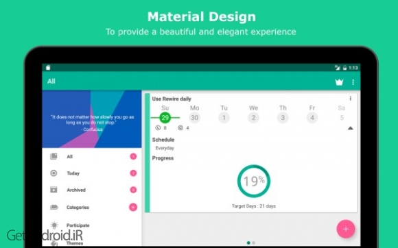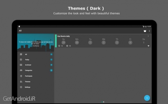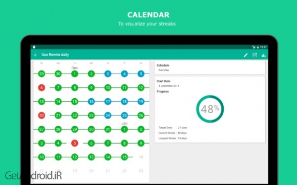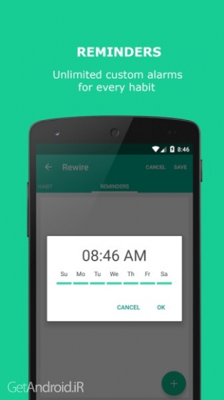 برنامه ای کاربردی برای افرادی است که بسیاری از کارهای خود را طبق عادت روزمره انجام میدهند و یا انجام دادن آن ها جزئی از باید های زندگی است. با کمک این برنامه شما میتوانید زمان رفتن به باشگاه و یا برخواستن از خواب صبحگاهی و … را تنظیم کنید تا برنامه به شما یادآوری کنید. موزیک ها قبل ار رفتن به باشگاه پخش میشوند، حتی میتوانید یادداشت های مهم را دارای هشدار کنید تا در بازه زمانی مشخص شمارا باخبر سازد. تمامی داده ها در برنامه Rewire قابل پشتیبان گیری هستند و شما میتوانید داده ها را در DropBox آپلود کنید. شما میتوانید عادت های روزانه خود را بر اساس نوشتاری تعیین نموده و از طریق نوار اطلاع رسانی از آن ها باخبر شوید. همچنین شما می توانید از تقویم های مختلف نظیر تقویم گوگل برای انتخاب روزها نیز استفاده نمایید. در سریع ترین زمان ممکن به اهداف خودتان برسید و به راحتی با عادت های خود کنار بیایید.برخی از ویژگی های Rewire – Habit & Goal Tracker Premium اندروید :