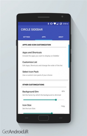 -گزینه ای برای اجرای مجموعه آیكون های سفارشی. هر مجموعه ایكونی را كه دوست دارید از فروشگاه نصب كنید و به راحتی از نوار كناری دایره انتخاب كنید