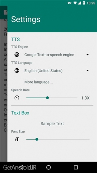 • به شدت توصیه می کنیم [Speech Services by Google] را به عنوان موتور گفتار نصب و استفاده کنید، بهترین سازگاری را با این برنامه دارد.