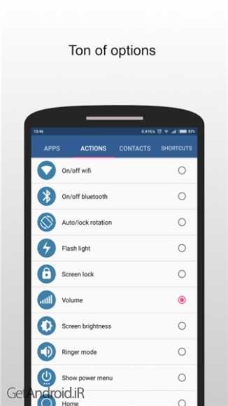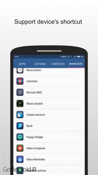 میانبرهای پشتیبانی شده در حال حاضر: برنامه ها، مخاطبین، روشن/خاموش کردن وای فای، روشن/خاموش بلوتوث، چرخش خودکار، چراغ قوه، روشنایی صفحه، صدا، حالت زنگ، منوی پاور، صفحه اصلی، برگشت، اخیر، اعلان پایین، آخرین برنامه، شماره گیری، گزارش تماس و میانبرهای دستگاه