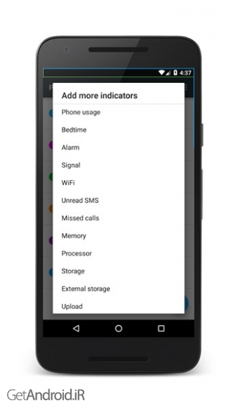 شاخص های آماده برای استفاده: باتری، پردازنده، حافظه، سیگنال، وای فای، مصرف میزان داده ، هشدار خواب، فضای ذخیره سازی، پیامک، تماس های از دست رفته، استفاده از شبکه و ...
