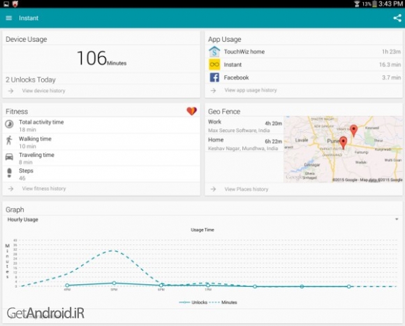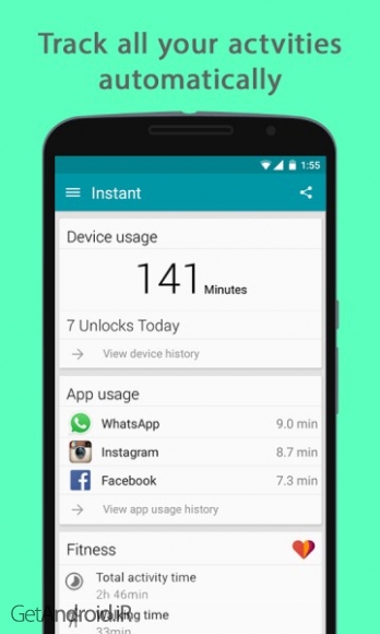 بطور خودکار زمان استفاده از تلفن، اپ، فیتنس، مکان ها، وقت خواب، و زمان مسافرت تان را دنبال کنید. این اپ با نام (اینستانت) به شما این امکان را می دهد فعالیت های تان را در داشبورد دنبال کنید و آنها را تحلیل کنید. این برنامه در واقع ابزاری برای ثبت اوقات مختلف زندگی خود است. برنامه به صورت بی وقفه در پشت زمینه اجرا میشود و میتواند آمار استفاده شما از گوشی و اپلیکیشن هایتان، میزان پیاده روی شما، چه مسافتی پیموده اید و چند بار در طول روز قفل صفحه گوشی تان را باز میکنید را نگه دارد. همچنین شما میتوانید یادآورهایی را با توجه به محدودیت هایتان در برنامه تعیین کنید. برای طراحی رابط کاربری این برنامه از همان ابتدا از طراحی ملموس (متریال) استفاده شده است. روش کار این برنامه تقریبا شبیه به برنامه های ورزشی است که آمار تمرینات انجام شده شما را نگه میدارند و میتوانند علاوه بر تعیین یادآورها اطلاعات تمرینات شما را نیز به صورت نموداری نشان دهند. با این برنامه میتوانید مرتبا عادات روزانه خود را چک کنید. هدف از ساخت این برنامه کمک به شما برای داشتن یک زندگی متعادل، گذراندن وقت بیشتر با اطرافیان تان و زندگی بیشتر در زمان حال است. این برنامه همانطور که گفته شد شبیه به برنامه های ورزشی که آمار تمرینات شما را نگه میدارند کار میکند و میتواند آمار عادات شما را نگه دارد. هم اکنون گزارشات هفتگی را با این اپ دریافت کنید. تمامی اطلاعات آن خصوصی است و تنها بر روی موبایل خودتان می ماند.این اپ بطور یکپارچه در بگراند کار می کند و نشان می دهد در روز چقدر از وقت تان را به موبایل و اپ اختصاص می کنید، چقدر راه می روید، چقدر بیرون می روید، چه مدت می خوابید، و چند بار قفل موبایل تان را باز می کنید. علاوه براین، آلارم هایی طبق محدودیت روزانه خودتان قابل تنظیم است. روشی عالی برای آنکه اعتیاد خود به موبایل را متوقف کنید.