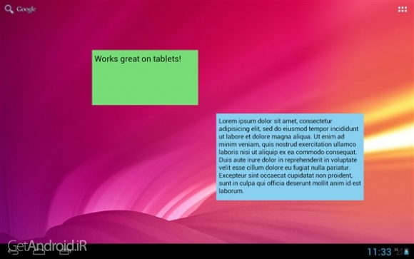 Simple Sticky Note Widget Plus یک ویجت یادداشت چسبناک بسیار کم حجم برای اندروید است که قابلیت تنظیم اندازه داشته و جای کمی را اشغال میکند. شما میتوانید این ویجت را هم در صفحه اصلی و هم در صفحه قفل قرار داده و نمایش دهید. نسخه Plus به شما اجازه می دهد رنگ پس زمینه، اندازه فونت را انتخاب کنید و متن یادداشت را در برنامه های دیگر به اشتراک بگذارید. این برنامه رتبه عالی را از مجله CNET دریافت کرده است. همچنین شما میتوانید یادداشت فارسی در این ویجت بنویسید.