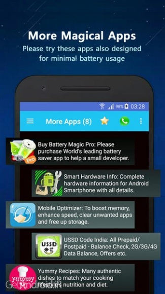 - بهینه ساز باتری با دریافت یك تخمین بلادرنگ از حجم زمانی كه باتری از دست داده اید. و متوقف كردن برنامه های پر مصرف