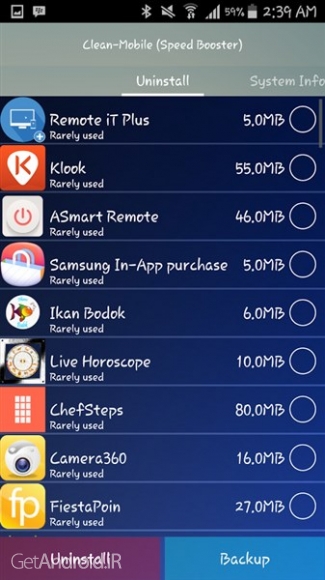 - مدیریت برنامه ها:انتخاب برنامه برای توقف نصب، دریافت اطلاعات سیستم در مورد سخت افزار تلفن، بك آپ گیری، ...)